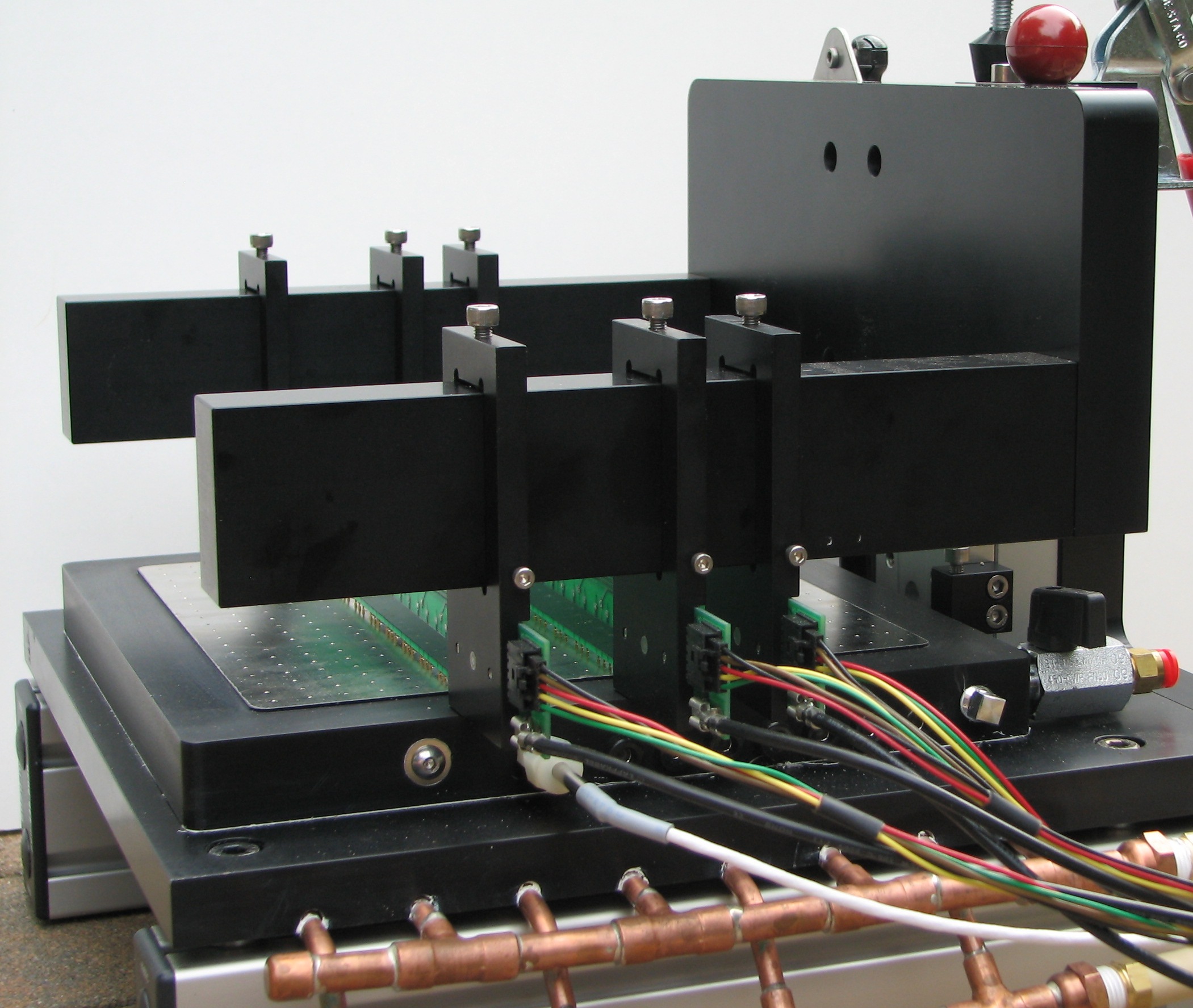 We put together a custom machine for testing the performance of specialized solar cell under simulated lighting conditions. This machine allowed custom spacing of front surface probes to check output in localized areas while controlling cell temperature.